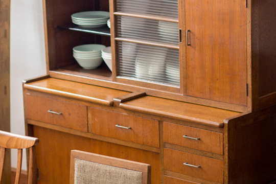 さらにレトロな食器棚で注目したいのが作業台の有無。レトロな食器棚の中には、固定式あるいは収納式の作業台が付いている作りのものがあるんです。広い作業台とはいえませんが、お茶の準備などちょっとした作業には十分なスペースを確保できるので、少しでもシンク以外にも作業スペースが欲しいと思っている方は、1度検討してみる価値がありますよ。
