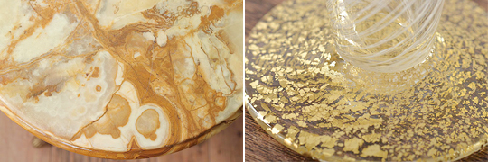 天板は、天然石のような美しい模様が入ったアイボリーのパール塗装が施され、脚には煌びやかなヴェネチアングラスの装飾、ベースはクロムメタルの塗装で仕上げられています。どこを切り取って見ても高級感たっぷりの一流品で、贅沢な素材使いと素晴らしい仕上げの技術が目を引きます。