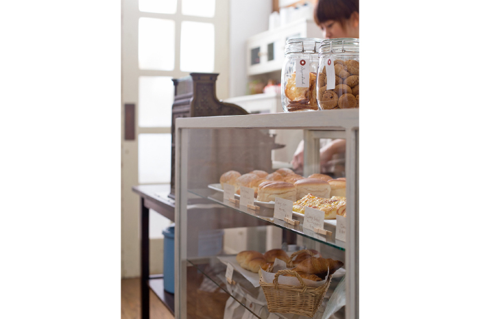 空間の主役は、焼きたてパンをディスプレイしたアンティークガラスケース。清潔感と温かみが感じられる淡い白のペイントカラーが、商品を引き立てながら、店内を明るく優しい雰囲気に演出してくれます。