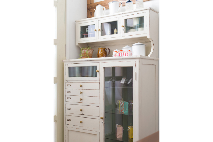 出入り口には、デンタルキャビネットを使ってジャムや紅茶などを賑やかに陳列しています。小さな棚や引き出しの多いデンタルキャビネットは、小振りな商品をディスプレイするのにぴったりのデザインです。