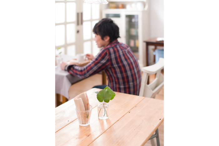 テーブルとチェアは、コンパクトで飽きのこない素朴なものを選びました。背もたれにポケットのついたチャーチチェアは、スカーフや帽子などちょっとしたものを収納したり、マガジンラックのように雑誌を収納することが可能です。中央のテーブルセットとカウンターテーブルは、あえて木の色味が違うものを選んで視覚的に空間を分けています。1人で読書をしたい人や、お友達とおしゃべりを楽しみたい人など、いろんな人が訪れる店舗だからこそ、ちょっとした空間の棲み分けが居心地の良さにつながります。