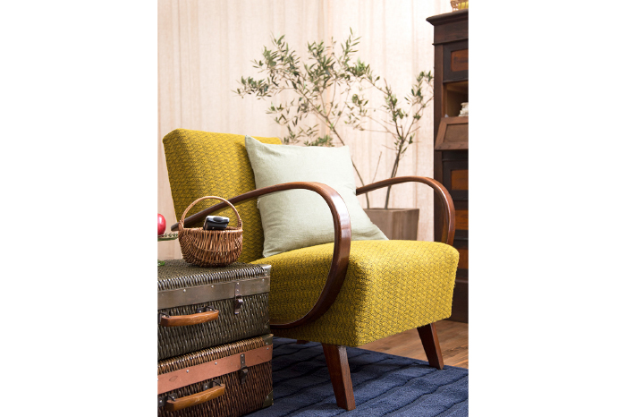 テレビを収納したガラス戸棚の向かいには、レトロなファブリックが素敵なアンティークソファ。一人掛けのソファは、アームにゆったりと肘を置いてくつろげるので、映画鑑賞や読書タイムにぴったりです。また、友人が来たときにはソファを向い合せて置いたり、掃除の際には移動させたり、簡単に動かせるのもうれしいポイントです。