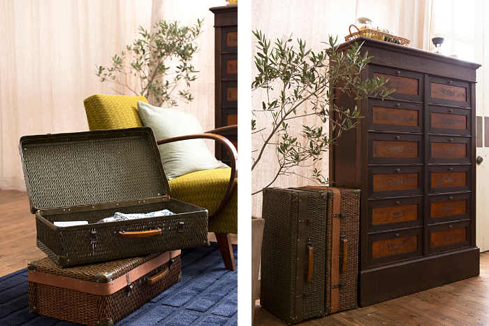 ソファのサイドテーブルとして使っているのは、アンティークのトランク。2段重ねにすることで、飲み物やリモコンなどを置くのにちょうど良い高さになります。こんな風にアンティークを自分らしく暮らしに取り入れてみるのも、インテリアを楽しむ秘訣ですね。