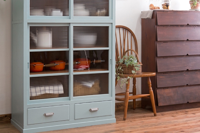収納には、壁際に置いたレトロな木味のパタパタ戸棚や、明るいペイントカラーのガラス戸棚が大活躍。すべて古い木味のもので揃えるのもレトロでいい雰囲気になりますが、ポイント的にペイント家具を取り入れると、より可愛らしい印象のナチュラルな空間になります。木製の小ぶりな本棚には、お母さんがいつでも編み物や読書を楽しめるように、趣味の道具を見せながら収納しています。