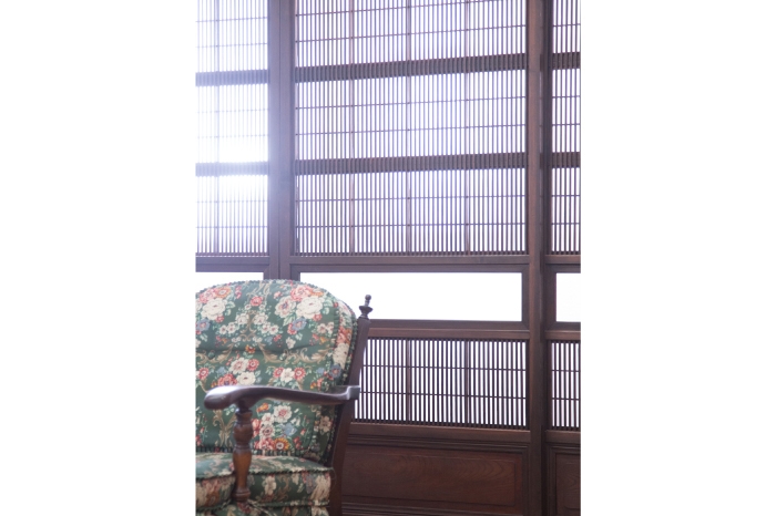 存在感のある飾り棚とソファは、どちらかというと洋風なテイストが強めに出ているので、その他の細かな部分に和の要素を取り入れました。建具には格子戸を選ぶことで、洋室でもグッと和の印象は強まります。このおかげで、植木鉢に見立てた木製火鉢や、花台のようにして使っているちゃぶ台、その後ろにディスプレイした欄間など、お部屋に散りばめた和の趣も十分活きてきますよ。
