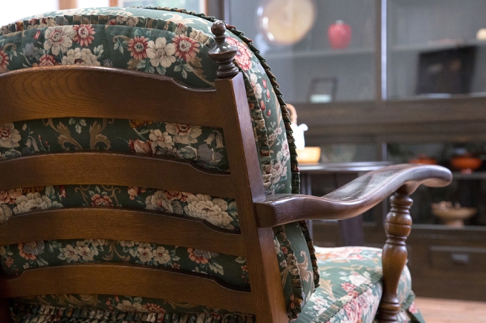 空間の上質さを演出するのは、重厚な和箪笥や大正ロマンの雰囲気を感じさせる大きな飾り棚。日本の古き良き時代の香りが漂います。シックなファブリックが特徴的な飛騨産業のソファは、格調高い見た目が上品な和家具とも相性抜群です。和箪笥や飾り棚と相まって、お部屋全体の雰囲気をより一層引き立てています。このようなソファは、畳の生活では立ったり座ったりが大変というご年配の方にも優しいところがうれしいですよね。