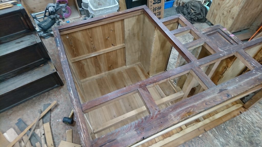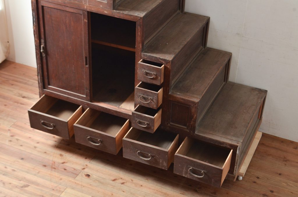 階段箪笥のリペア作業はその独特な形と大きさからなかなか手のかかる代物です。