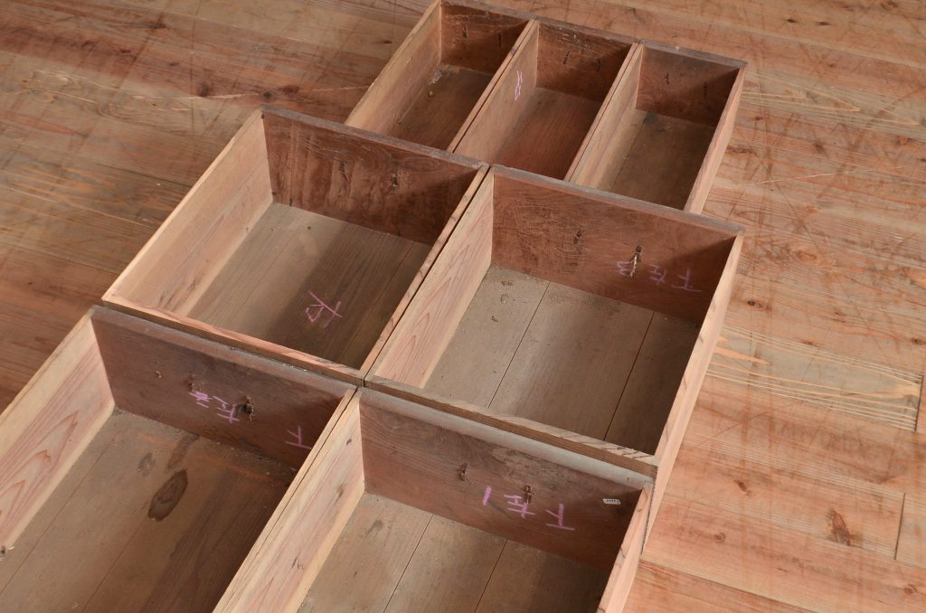 内側それぞれにチョークで書かれた「引き出しの位置」を示す文字も気になりますね。