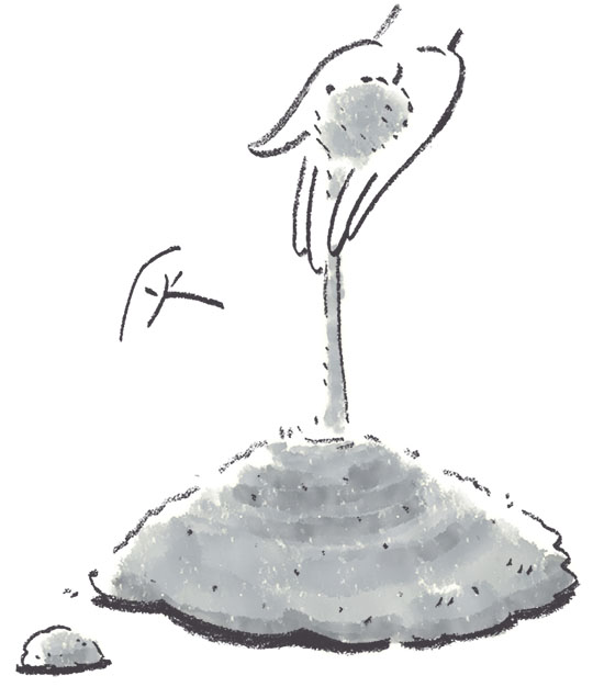 3本の爪のうち、2本を手前に、もう1本が向こう側になるように置きます。灰の中心に、水平を保ったまま、少しずつ沈めていきましょう。