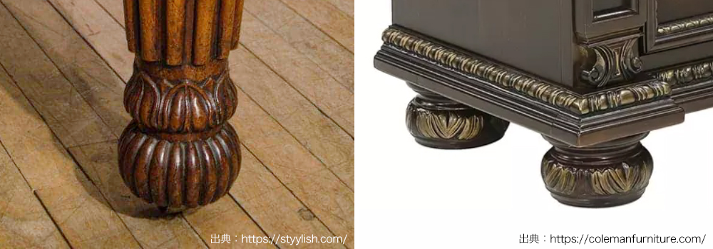 彫刻で表面に模様を施したスタイルもあり、脚だけでなく家具全体をより華やかに豪華に飾るデザインです。