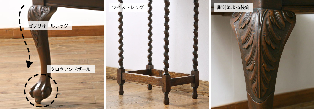 その他にもツイストレッグのものや、至る所に細やかな彫刻が施されたものなど、様々な技法を駆使しながら優雅な脚が作られました。