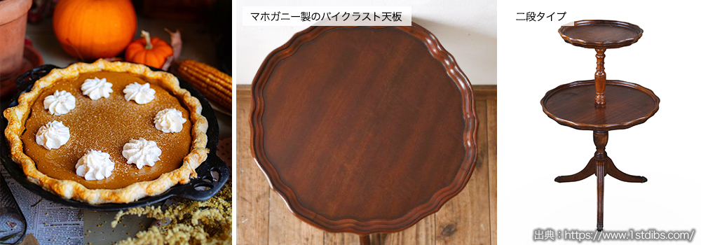 中でもクイーン・アン様式やチッペンデール様式で作られたパイクラストテーブルが有名で、特にトライポッド(3本脚が支柱を支えるようなスタイル)の脚を持つ天板のほとんどがパイクラストのデザインで作られました。