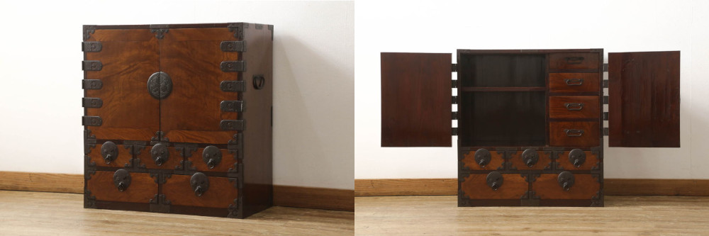 素材には欅材を使用しているものが多く、船箪笥、帳場箪笥ならではの豪華なつくりにも注目です。