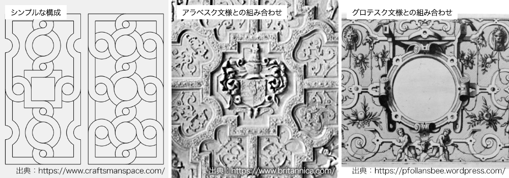 シンプルにひも状の形だけで構成されるデザインもあれば、スクロール・アラベスク・菱形などの文様と織り交ぜられたり、グロテスク文様(植物・人・動物などが融合した文様)の背景や枠組み部分で使用されたりと、複雑に構成されるデザインもあります。