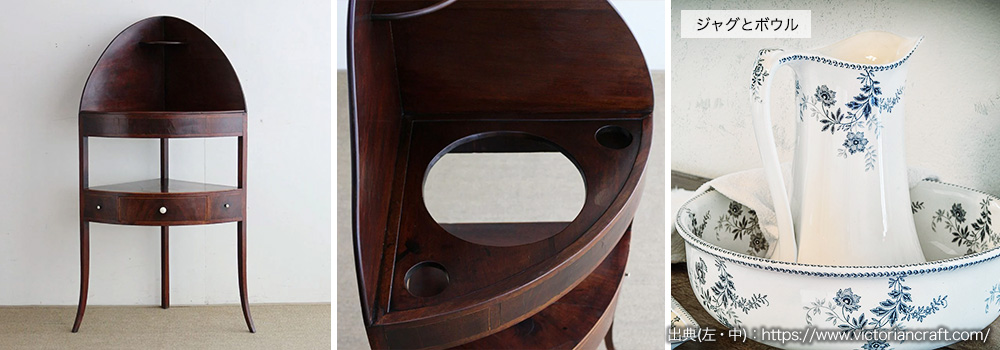 ウォッシュスタンドとは、水道がまだ発達していない時代に、水を要する作業を行う目的で、寝室・キッチン・リビングなどに置かれていた家具のことです。正式には「ウォッシュハンドスタンド」といいます。