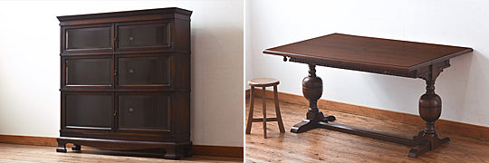 重厚さを感じさせる特徴は2つあります。ひとつはしっかりとした作りであること。もうひとつは濃い茶色をしているということです。先ほどご紹介した和洋折衷デザインの家具の他に、イギリスアンティークの家具もこの条件によく合いますね。