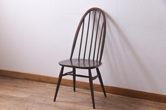「クエーカーチェア」とは、背もたれ部分が高くシャープなアーコール社のボウバックタイプのウィンザーチェアです。フープバックチェアの進化系モデルであり、Uの字に近い極限まで曲げた曲木の背枠が強いインパクトを生みました。背が高くしなやかに湾曲した背もたれは、背中全体を包み込むように支えてくれるので、リラックスして体を預けることができます。背が高い椅子に分類されますが、そのシャープなデザインで圧迫感のないコーディネートが可能です。