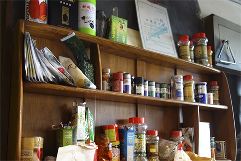 キッチンからスタートして、店内をぐるーっと見渡すと、気泡ガラス入りの収納棚は和製、スパイスの並ぶ棚はイギリス製。
