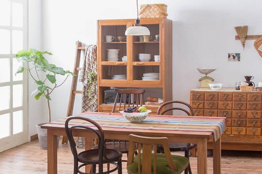 スタイルがばらばらでもうまくまとまったポイントは、ナチュラルな木の風合いが楽しめるアイテムをたくさん取り入れたこと。色々とミックスさせてみても、素材感や色合いなど、どこかで統一感を持たせれば、意外としっくりまとまるものですよ。