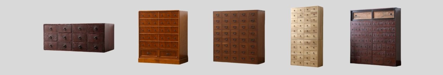 当店ではアンティーク・ヴィンテージの年代ものを中心に、大小様々なデザインの薬箪笥を取り揃えています。