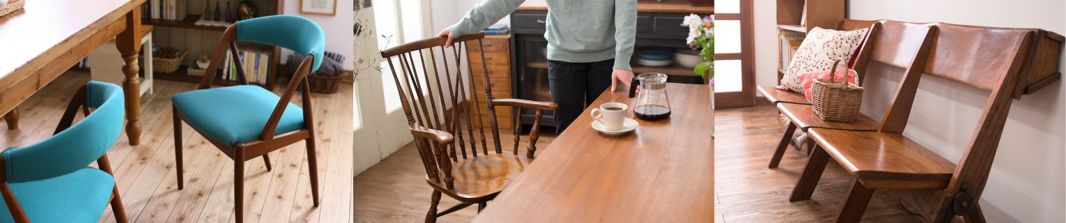 座るために使うアンティークの椅子やチェアですが、同じ「座る」でも用途に応じて、それに適したアンティーク椅子・チェアの特徴は異なるものです。せっかくならおしゃれさだけでなく快適に使える実用性も兼ね備えた1脚を選びたいところ。そこでこの項ではアンティークの椅子やチェアを取り入れる場面として人気の「ダイニング」「カウンター」「書斎」「子供(キッズ)用」「ガーデニング」「キッチン」「カフェや美容室などの店舗什器」という7つのシーン別に、チェックしておきたい選び方のコツをご紹介します。