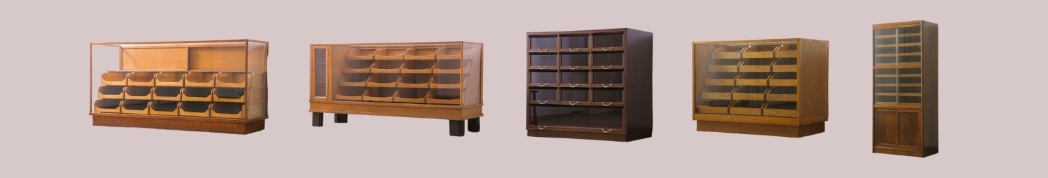 現代では食器棚やコレクションケースとして活用されることもあり、店舗什器としてだけでなく自宅に取り入れている例も多くあります。