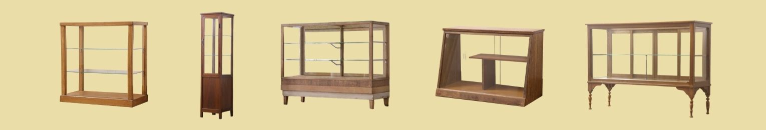 昔ながらの木枠のガラスケースから、多角形ガラスケース、曲げガラスのカウンターショーケースなど幅広いデザイン・形・大きさの古家具のガラスケースを取り揃えています。