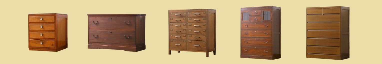 昔懐かしいデザインの引き出し収納や整理箪笥、ドロワー、サイドチェストなど幅広いデザイン・形・大きさの古家具のチェスト・箪笥を取り揃えています。